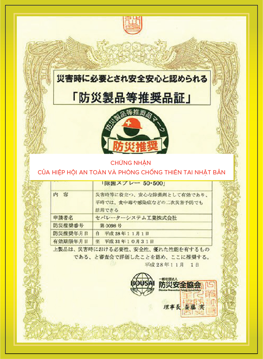 Tại Nhật Bản, Hiệp hội An toàn và Phòng chống thiên tai đã chứng nhận bộ sản phẩm KAMISAMA là “Sản phẩm được khuyến nghị sử dụng cho công tác phòng chống thiên tai” do đặc tính khử mùi, khử khuẩn tuyệt vời, cùng với sự an toàn tuyệt đối và hạn sử dụng đến 5 năm.