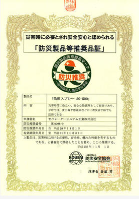 Hiệp hội An toàn và Phòng chống thiên tai Nhật Bản chứng nhận bộ sản phẩm KAMISAMA là “Sản phẩm được khuyến nghị sử dụng cho công tác phòng chống thiên tai”.